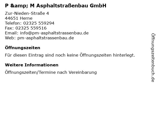 | Öffnungszeiten P & M Asphaltstraßenbau GmbH in Herne anzeigen | |