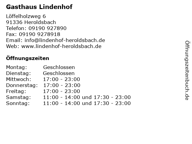 | Öffnungszeiten Gasthaus Lindenhof in Heroldsbach anzeigen | |