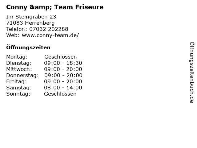 | Öffnungszeiten Conny & Team Friseure in Herrenberg anzeigen | |