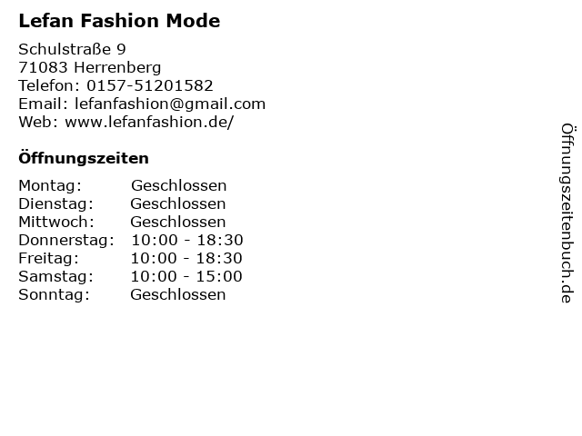 | Öffnungszeiten Lefan Fashion Mode in Herrenberg anzeigen | |