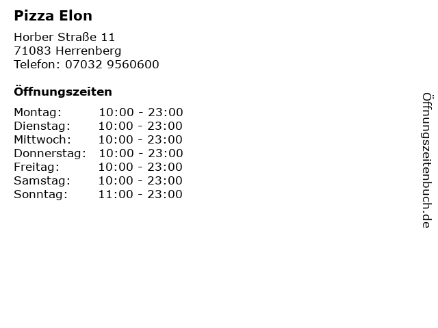 | Öffnungszeiten Pizza Elon in Herrenberg anzeigen | |