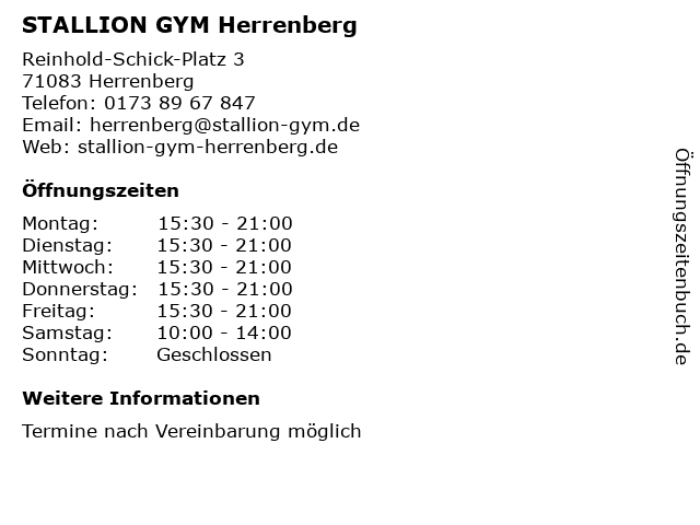 | Öffnungszeiten STALLION GYM Herrenberg in Herrenberg anzeigen | |