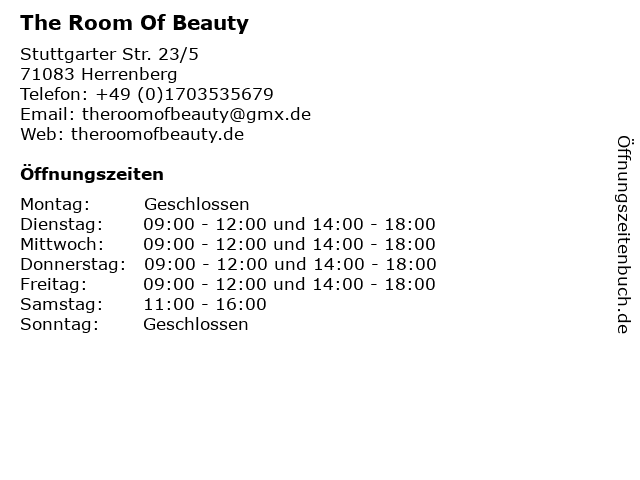 | Öffnungszeiten The Room Of Beauty in Herrenberg anzeigen | |