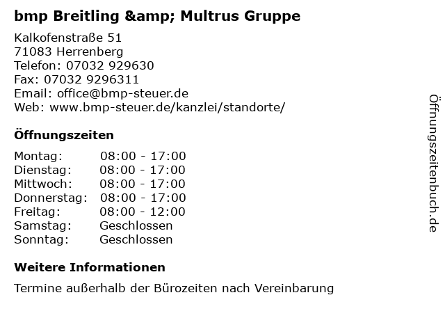 4 bmp Breitling & Multrus Gruppe Steuerberatung und Wirtschaftsprüfung (Entfernung: 14,63 km) Maieräckerstraße 25, 72108 Rottenburg 5 Gruppe 91 Kulturproduktion Herbert Rösler e.V. (Entfernung: 14,85 km) Sindelfinger Str. 30, 72070 Tübingen 6 Die Einrichtung Breitling - Hauptfleisch GbR (Entfernung: 15,28 km) Sindelfinger Straße 30, 71032 Böblingen  |