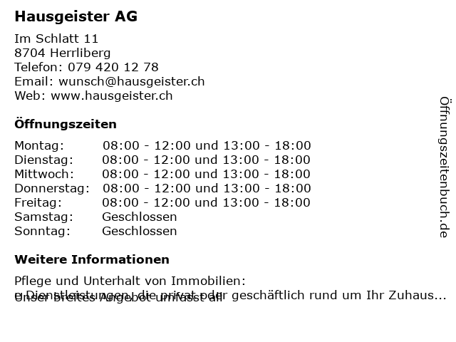 | Öffnungszeiten Hausgeister AG in Herrliberg anzeigen | |