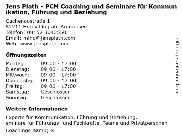 Branchen & Suchbegriffe zu Jens Plath - PCM Coaching und Seminare für Kommunikation, Führung und Beziehung:beziehung, coaching, eheberatung, führung, jens, kommunikation, lebenscoaching, pcm, personalberatung, plath, seminare |