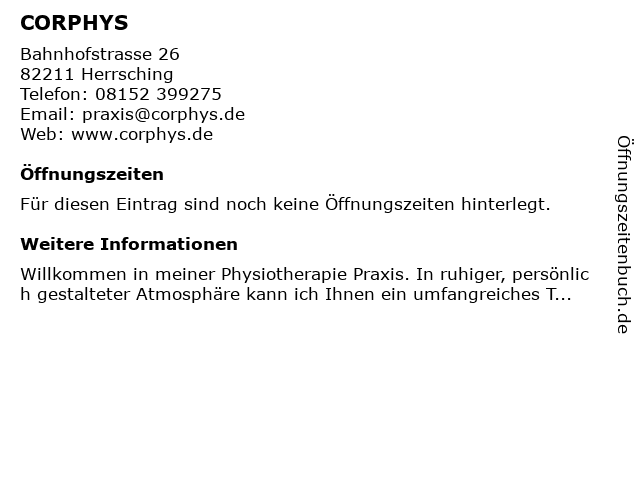| Öffnungszeiten CORPHYS in Herrsching anzeigen | |