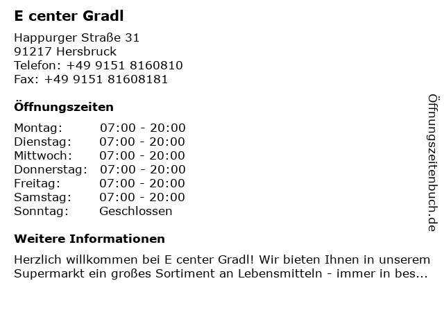 | Öffnungszeiten E center Gradl in Hersbruck anzeigen | |