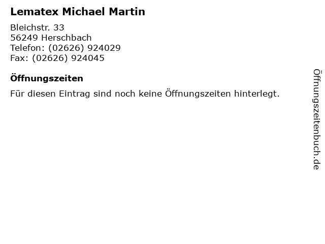 | Öffnungszeiten Lematex Michael Martin in Herschbach anzeigen | |