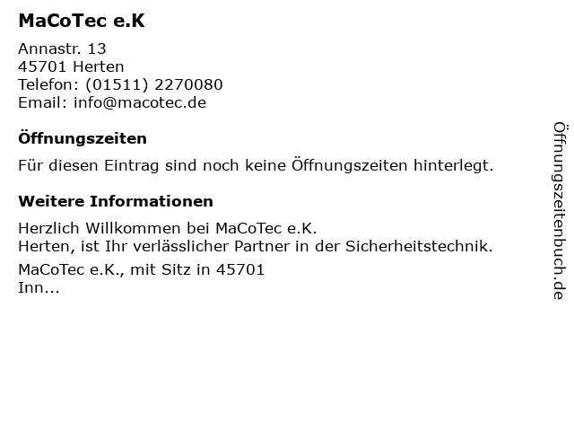 | Öffnungszeiten MaCoTec e.K in Herten anzeigen | |