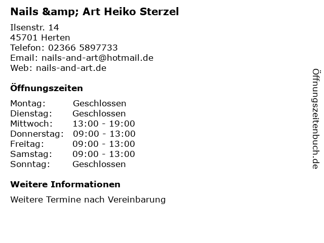 | Öffnungszeiten Nails & Art Heiko Sterzel in Herten anzeigen | |