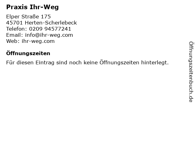 | Öffnungszeiten Praxis Ihr-Weg in Herten-Scherlebeck anzeigen | |
