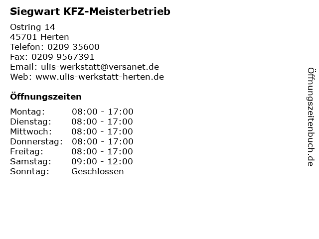 | Öffnungszeiten Siegwart KFZ-Meisterbetrieb in Herten anzeigen | |