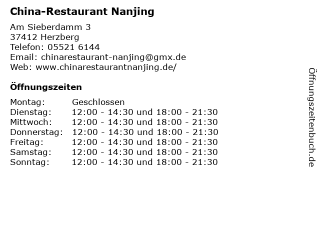 | Öffnungszeiten China-Restaurant Nanjing in Herzberg anzeigen | |