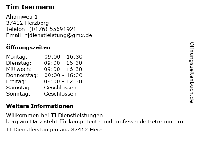 | Öffnungszeiten Tim Isermann in Herzberg anzeigen | |