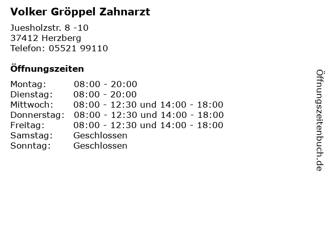 | Öffnungszeiten Volker Gröppel Zahnarzt in Herzberg anzeigen | |