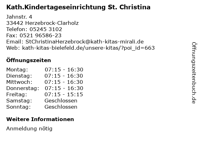 1 Pfarrbüro Kath. Kirchengemeinde St. Christina Herzebrock-Clarholz (Entfernung: 0,13 km) Klosterstr. 6, 33442 Herzebrock-Clarholz 5 6 IN VIA Kath. Mädchensozialarbeit Im Caritaszentrum (Entfernung: 15,77 km) Alleestr. 29, 59320 Ennigerloh |