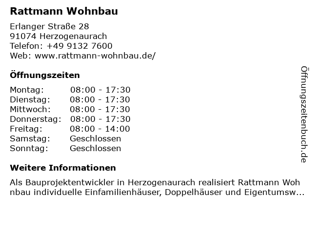| Öffnungszeiten Rattmann Wohnbau in Herzogenaurach anzeigen | |
