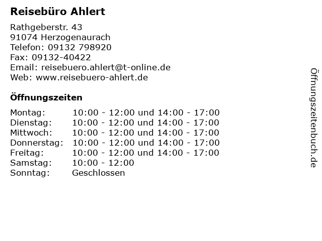 | Öffnungszeiten Reisebüro Ahlert in Herzogenaurach anzeigen | |