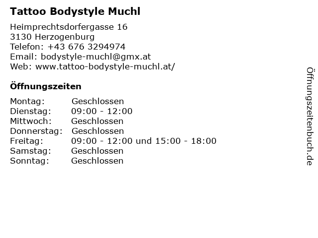 | Öffnungszeiten Tattoo Bodystyle Muchl in Herzogenburg anzeigen | |