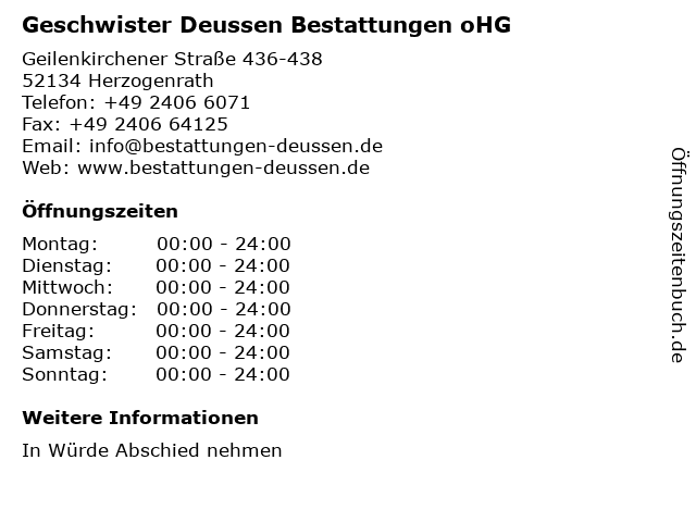 1 Geschwister Deussen Bestattungen oHG (Entfernung: 4,85 km) Alte Aachener Str. 23, 52531 Übach-Palenberg 2 Bestattungen Palm Inh.Andreas Scholven (Entfernung: 0,40 km) Kirchrather Straße 178, 52134 Herzogenrath 6 |