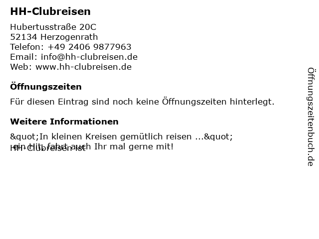 | Öffnungszeiten HH-Clubreisen in Herzogenrath anzeigen | |