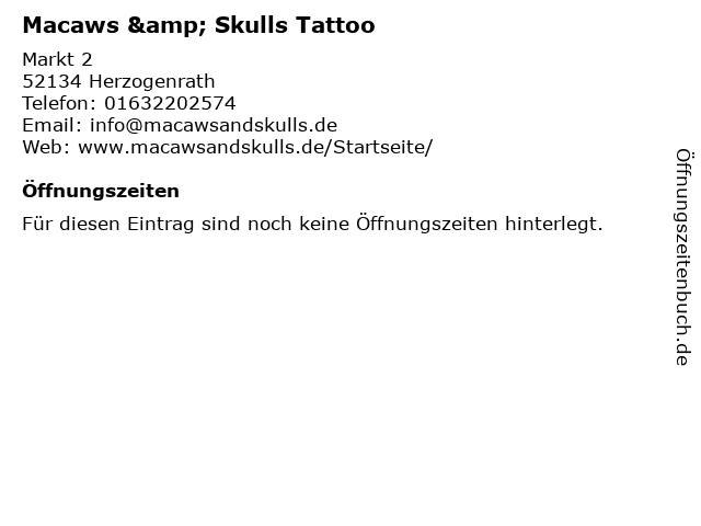 | Öffnungszeiten Macaws & Skulls Tattoo in Herzogenrath anzeigen | |