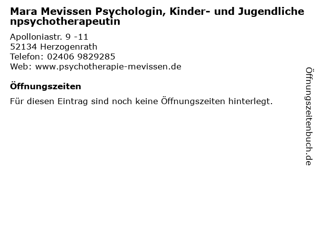 | Mara Mevissen Psychologin, Kinder- und Jugendlichenpsychotherapeutin anrufen | |