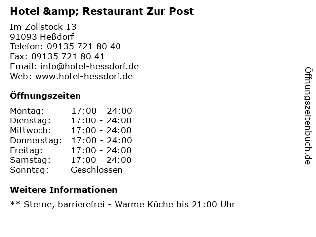 | Öffnungszeiten Hotel & Restaurant Zur Post in Heßdorf anzeigen | |