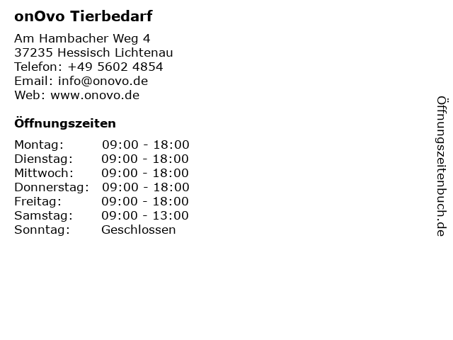 | Öffnungszeiten onOvo Tierbedarf in Hessisch Lichtenau anzeigen | |
