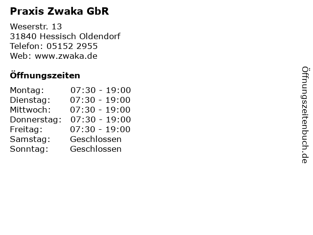 | Öffnungszeiten Praxis Zwaka GbR in Hessisch Oldendorf anzeigen | |