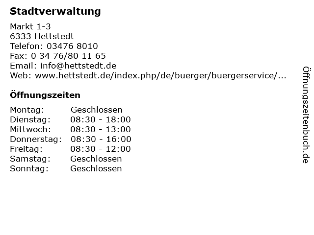 | Öffnungszeiten Stadtverwaltung in Hettstedt anzeigen | |