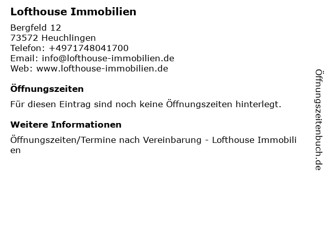 | Öffnungszeiten Lofthouse Immobilien in Heuchlingen anzeigen | |