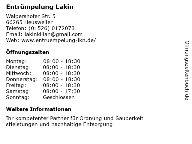 | Öffnungszeiten Entrümpelung Lakin in Heusweiler anzeigen | |