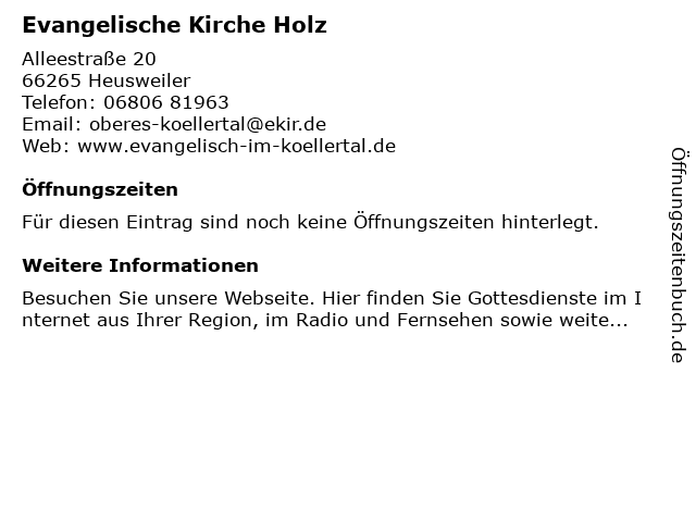 | Öffnungszeiten Evangelische Kirche Holz in Heusweiler anzeigen | |