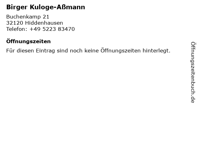 | Öffnungszeiten Birger Kuloge-Aßmann in Hiddenhausen anzeigen | |