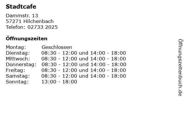 | Öffnungszeiten Stadtcafe in Hilchenbach anzeigen | |