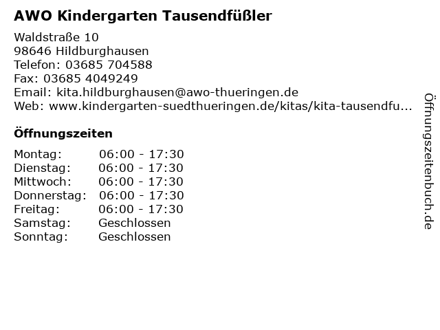 1 AWO Tagesgruppe Hildburghausen (Entfernung: 0,29 km) Geschwister-Scholl-Str. 10, 98646 Hildburghausen 5 AWO Kindertagesstätte Im Charlottenheim (Entfernung: 13,62 km) Gustav-Friedrich-Höfling-Straße 3, 98631 Römhild 6 AWO Kindergarten „Charlottenheim“ (Entfernung: 13,62 km) Gustav-Friedrich-Höfling Straße 3, 98630 Römhild |
