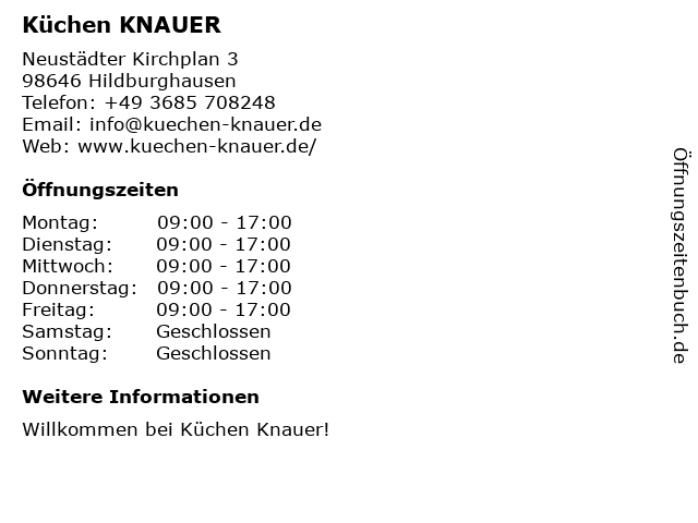 | Öffnungszeiten Küchen KNAUER in Hildburghausen anzeigen | |
