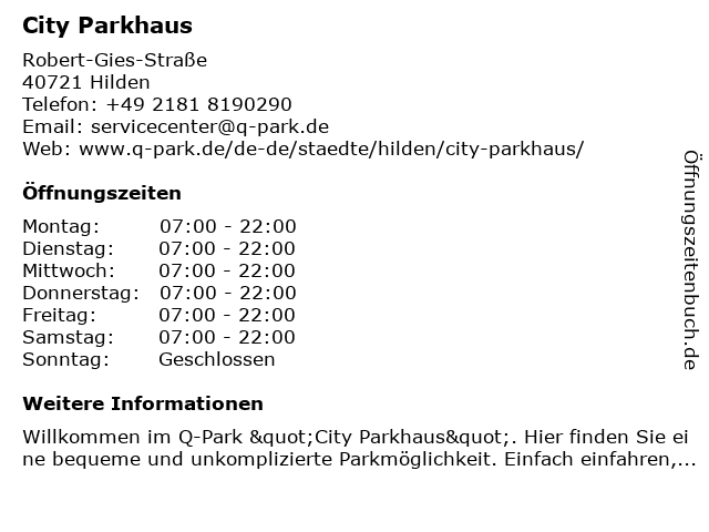 | Öffnungszeiten City Parkhaus in Hilden anzeigen | |