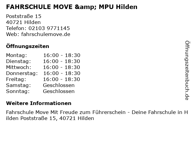 | Öffnungszeiten FAHRSCHULE MOVE & MPU Hilden in Hilden anzeigen | |