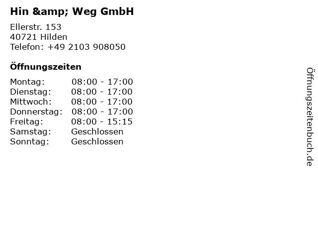| Öffnungszeiten Hin & Weg GmbH in Hilden anzeigen | |