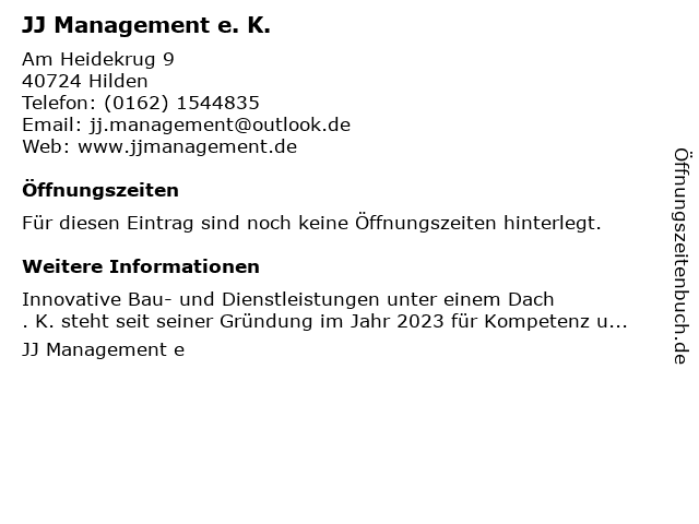 | Öffnungszeiten JJ Management e. K. in Hilden anzeigen | |