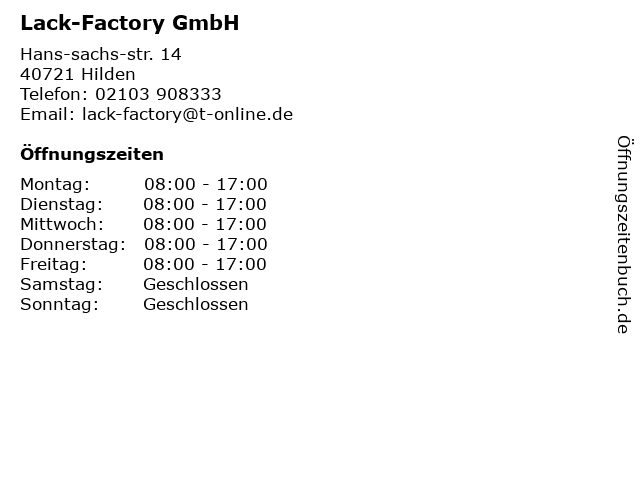 | Öffnungszeiten Lack-Factory GmbH in Hilden anzeigen | |
