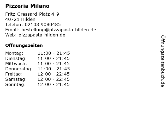 | Öffnungszeiten Pizzeria Milano in Hilden anzeigen | |
