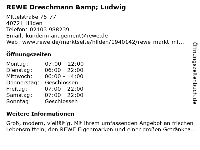 | Öffnungszeiten REWE Dreschmann & Ludwig in Hilden anzeigen | |