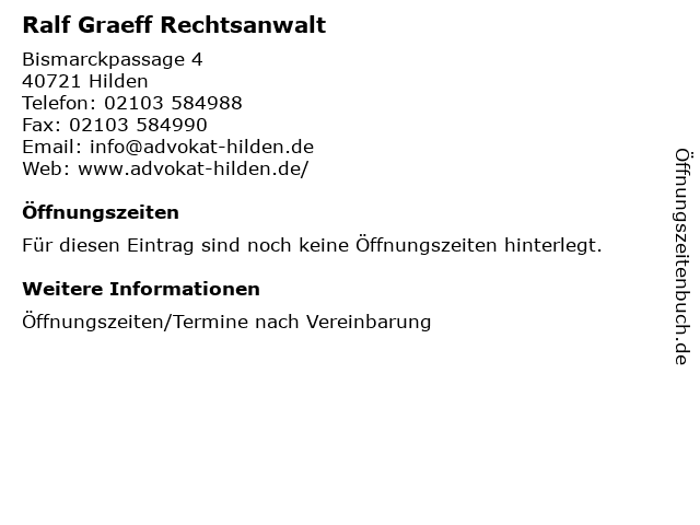 | Öffnungszeiten Ralf Graeff Rechtsanwalt in Hilden anzeigen | |
