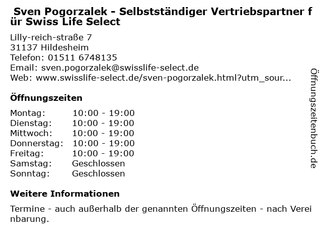 1 Tobias Clausing - Selbstständiger Vertriebspartner für Swiss Life Select (Entfernung: 0,00 km) Lilly-reich-straße 7, 31137 Hildesheim 2 Moritz Schulze - Selbstständiger Vertriebspartner für Swiss Life Select (Entfernung: 0,01 km) Lilly-reich-straße 7, 31137 Hildesheim 3 Valeria Zankevic - Selbstständige Vertriebspartnerin für Swiss Life Select (Entfernung: 16,10 km) Zuckerfabriksweg 1 und 3, 31319 Sehnde 4 Rescha Aykac - Selbstständige Vertriebspartnerin für Swiss Life Select (Entfernung: 16,10 km) Zuckerfabriksweg 1 und 3, 31319 Sehnde 5 Ilias Milkas - Selbstständiger Vertriebspartner für Swiss Life Select (Entfernung: 16,10 km) Zuckerfabriksweg 1 und 3, 31319 Sehnde 6 Stephan Fritzsche - Selbstständiger Vertriebspartner für Swiss Life Select (Entfernung: 16,10 km) Zuckerfabriksweg 1 und 3, 31319 Sehnde |