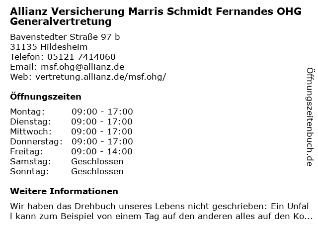 1 Allianz Versicherung Marris und Schmidt OHG Agentur (Entfernung: 0,01 km) Bavenstedter straße 97 b, 31135 Hildesheim 2 Allianz Versicherung Makan Khorosan Generalvertretung (Entfernung: 2,83 km) Goschenstraße 76, 31134 Hildesheim 3 Allianz Versicherung Markus Erlach e.K. Generalvertretung (Entfernung: 3,89 km) Dingworthstraße 24, 31137 Hildesheim 4 Allianz Versicherung Martin Heiduk Generalvertretung (Entfernung: 5,02 km) Peter-henlein-straße 19, 31139 Hildesheim 5 Allianz Versicherung Martin Stegner Generalvertretung (Entfernung: 5,54 km) Martin-boyken-ring 54, 31141 Hildesheim 6 AXA Generalvertretung Berthold Glaser Versicherungsagentur (Entfernung: 11,32 km) Bortumweg 3, 31157 Sarstedt |