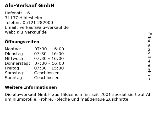 | Öffnungszeiten Alu-Verkauf GmbH in Hildesheim anzeigen | |